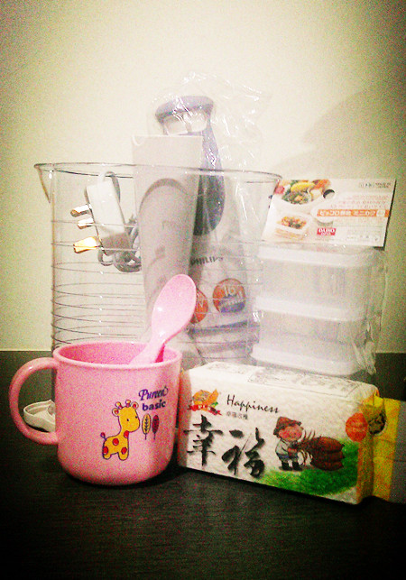 为了食物泥而买了hand blender,只看到了2个牌子,philips & kenwood。选择了Philips,因为。。。比较便宜!:p 也买了一些小盒子来装食物泥。而餐具和香米呢,都是朋友送的。